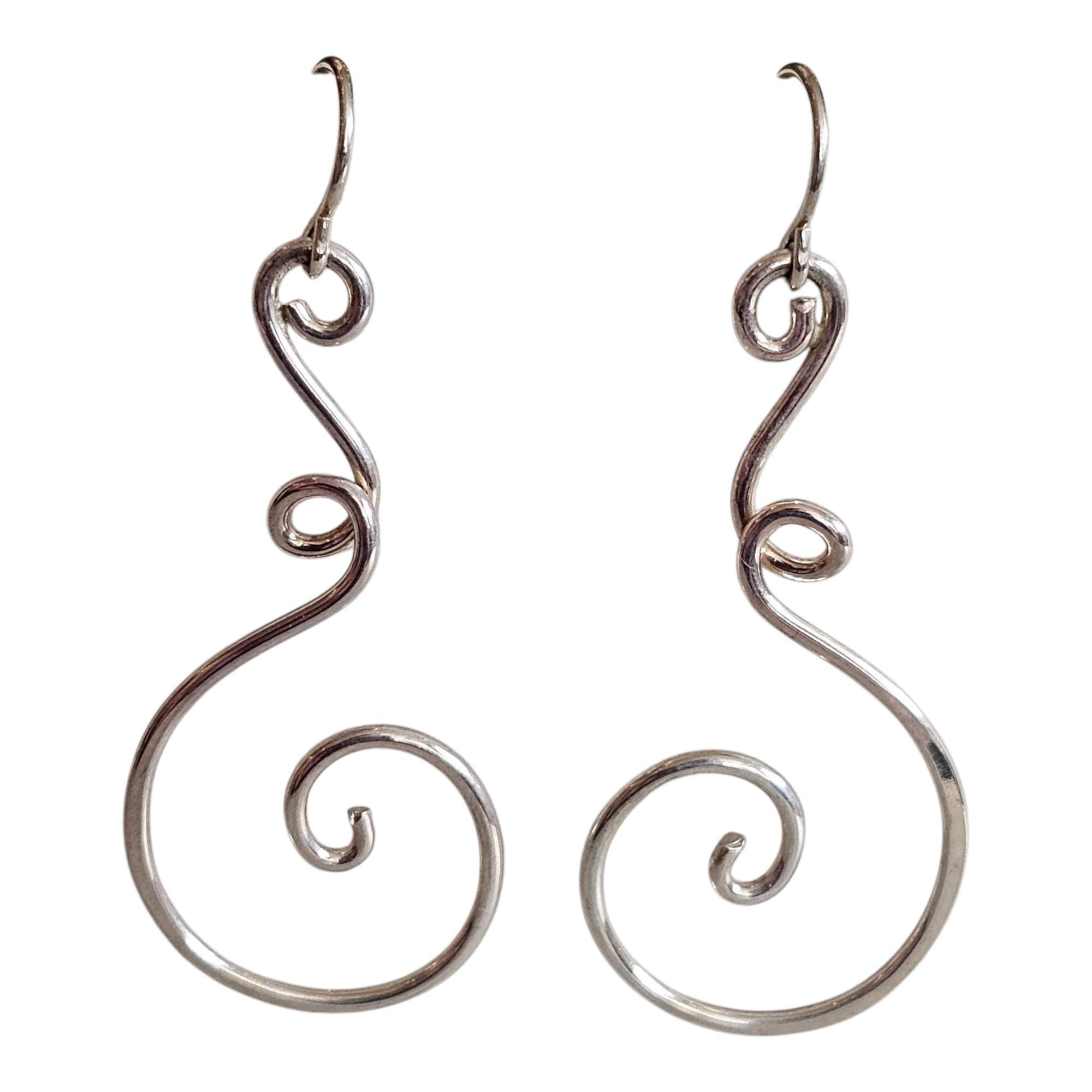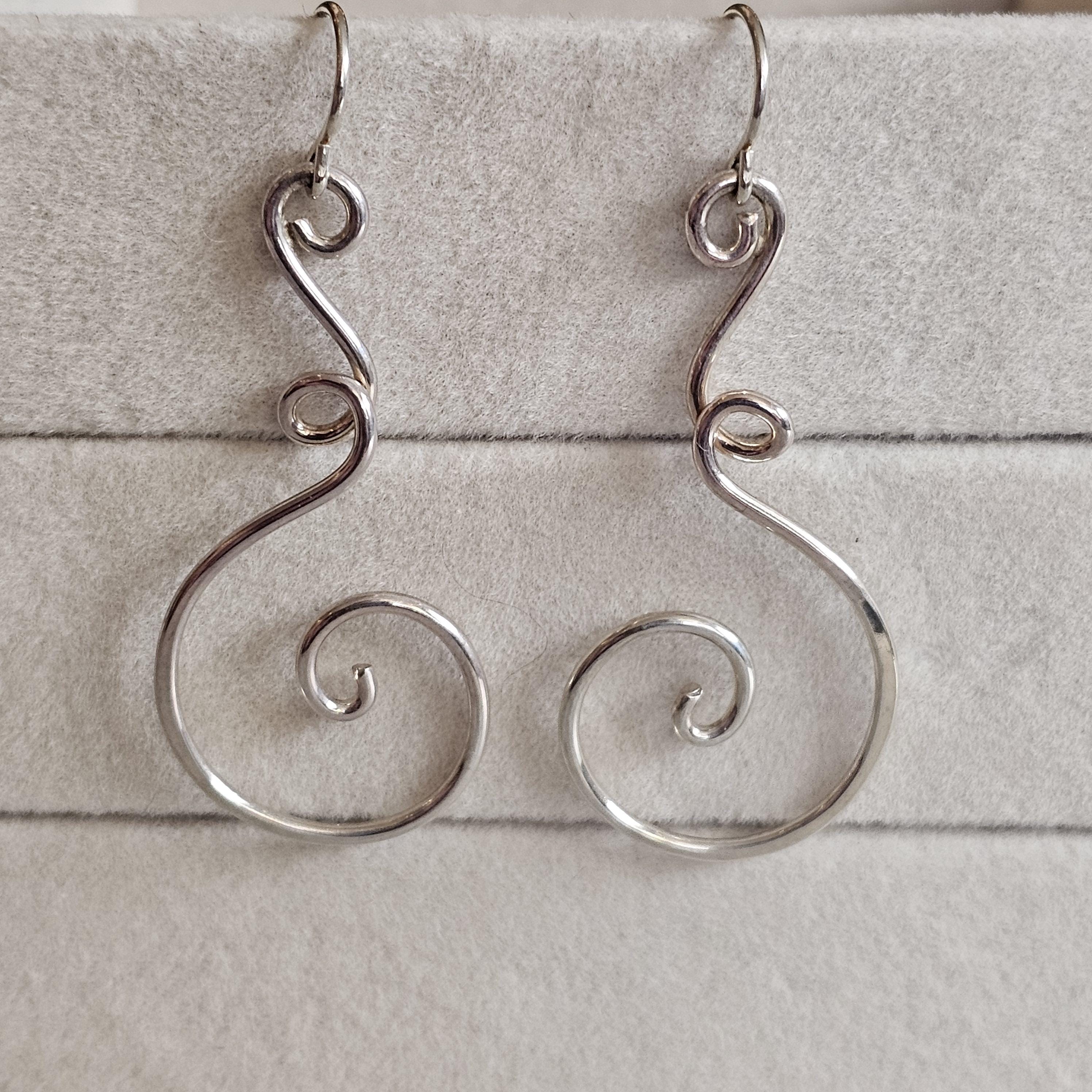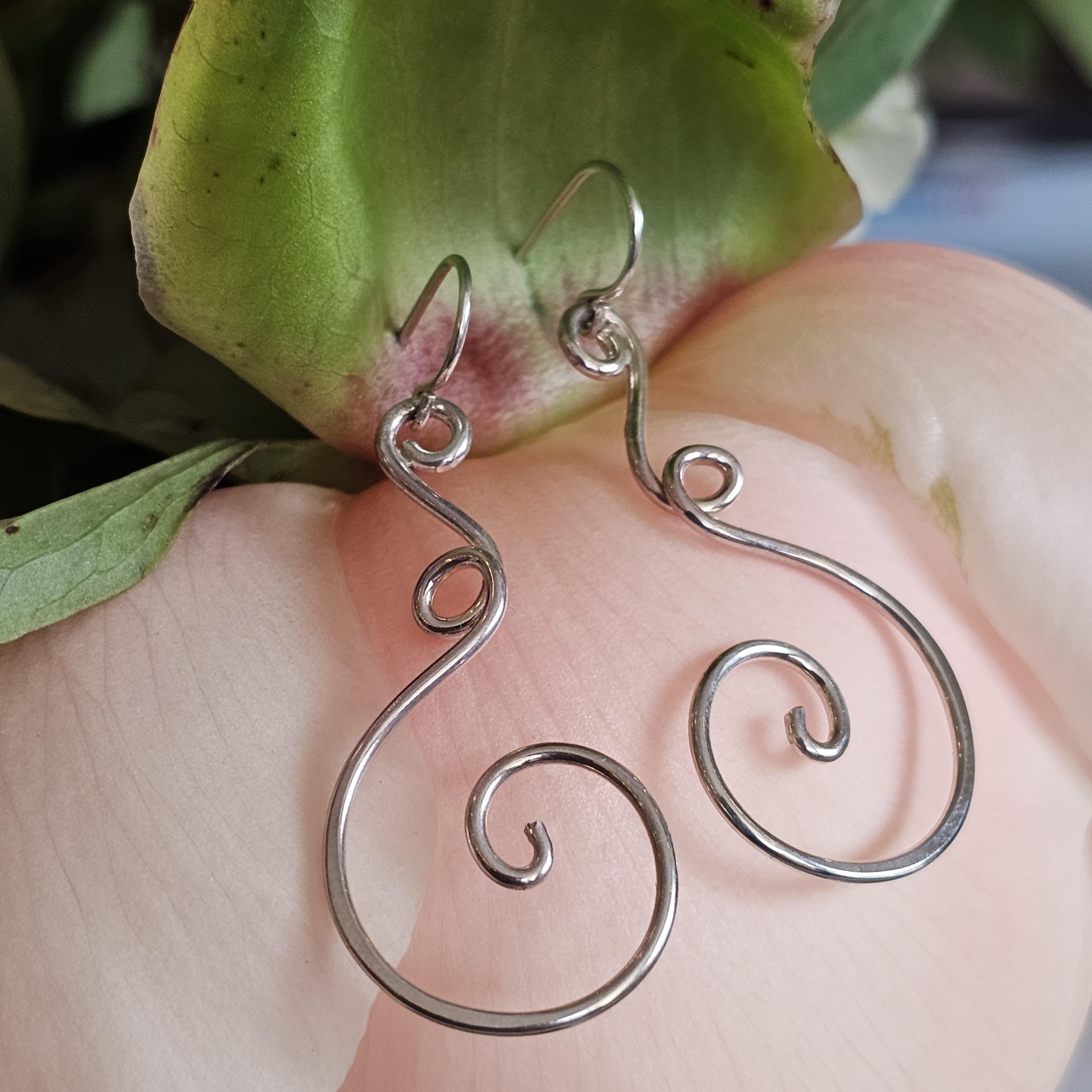 These curlicue spiral earrings are handmade from sturdy 16 gauge sterling silver wire and hammered to harden them so that they will keep their shape. They are smoothly curved and nicely polished, and are lightweight and comfortable to wear.