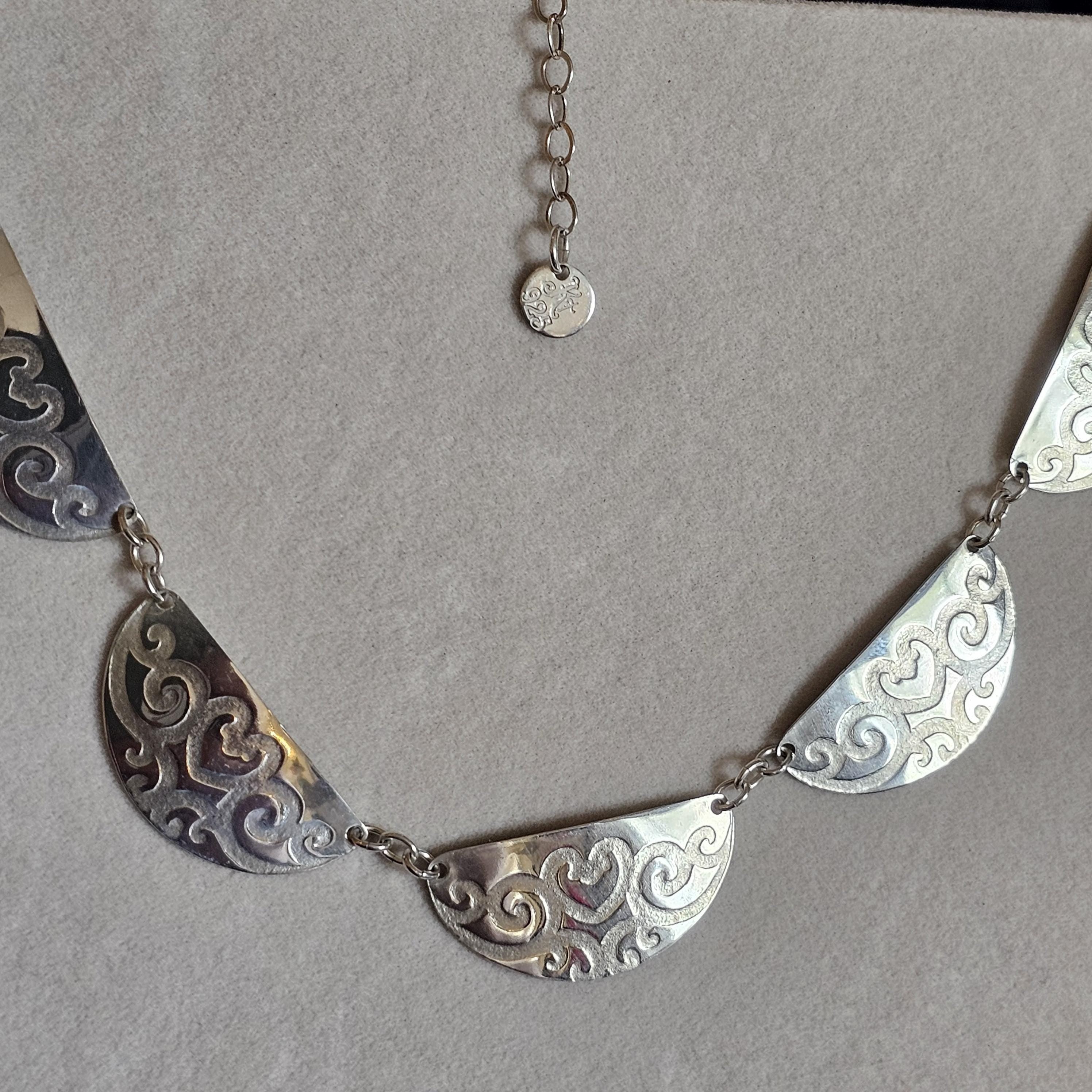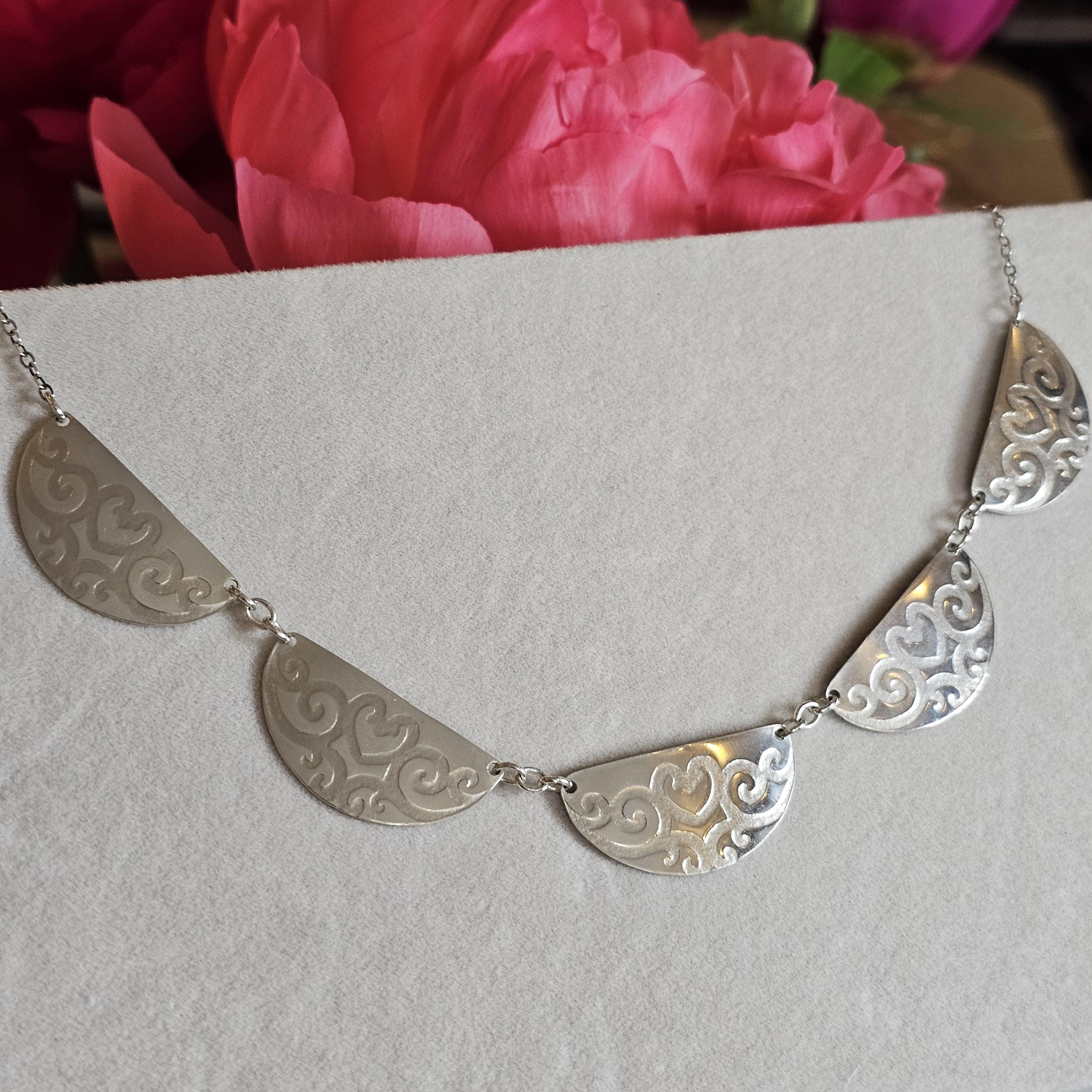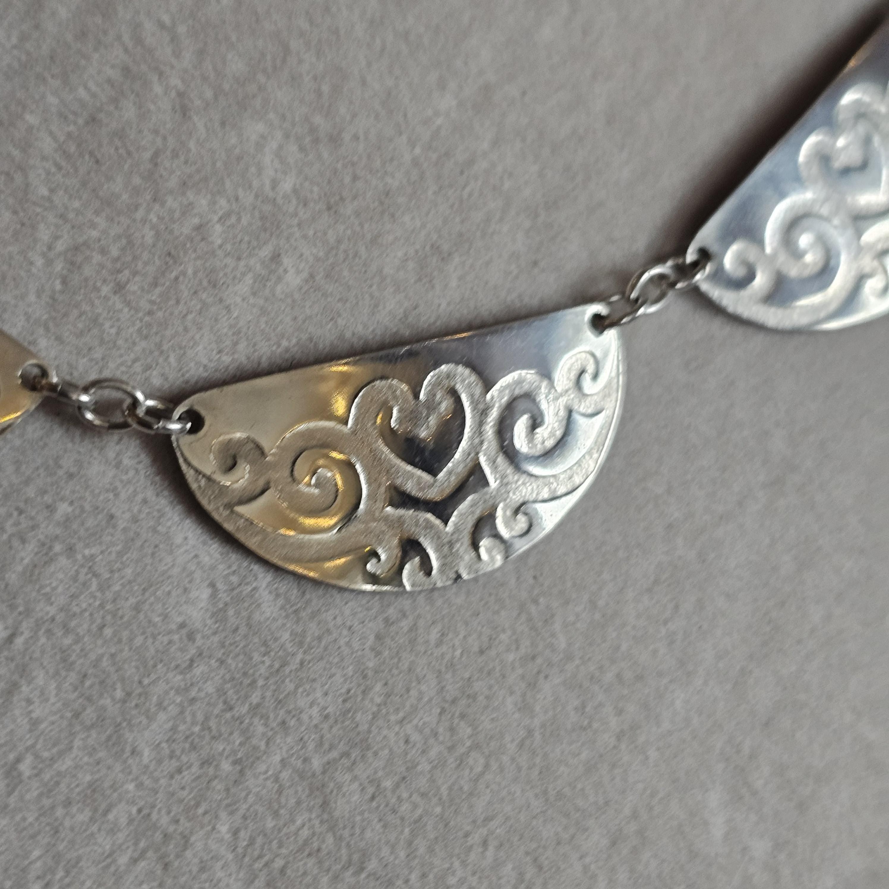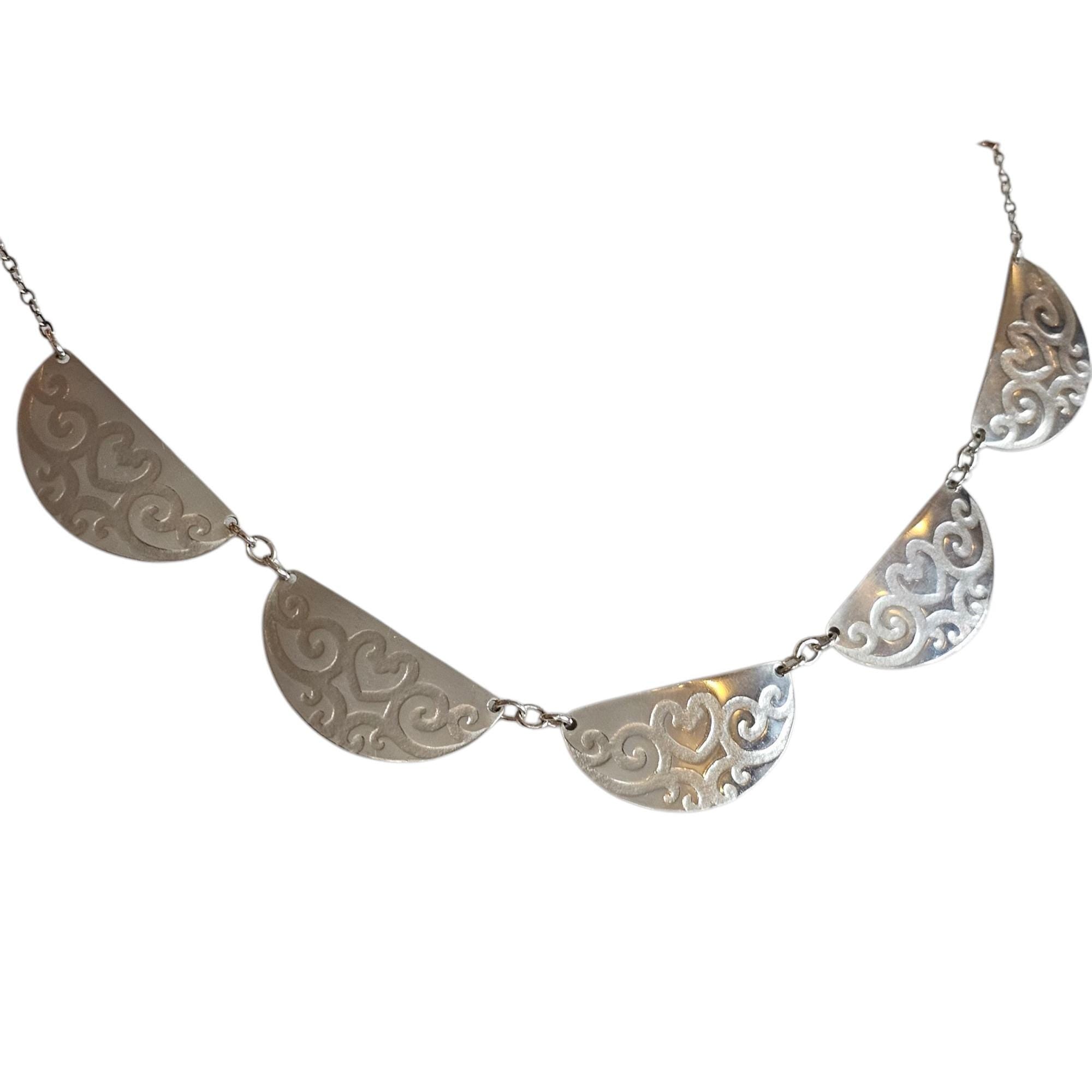 Roller Printed Sterling Silver Scalloped Bib Necklace with Heart Vine Design