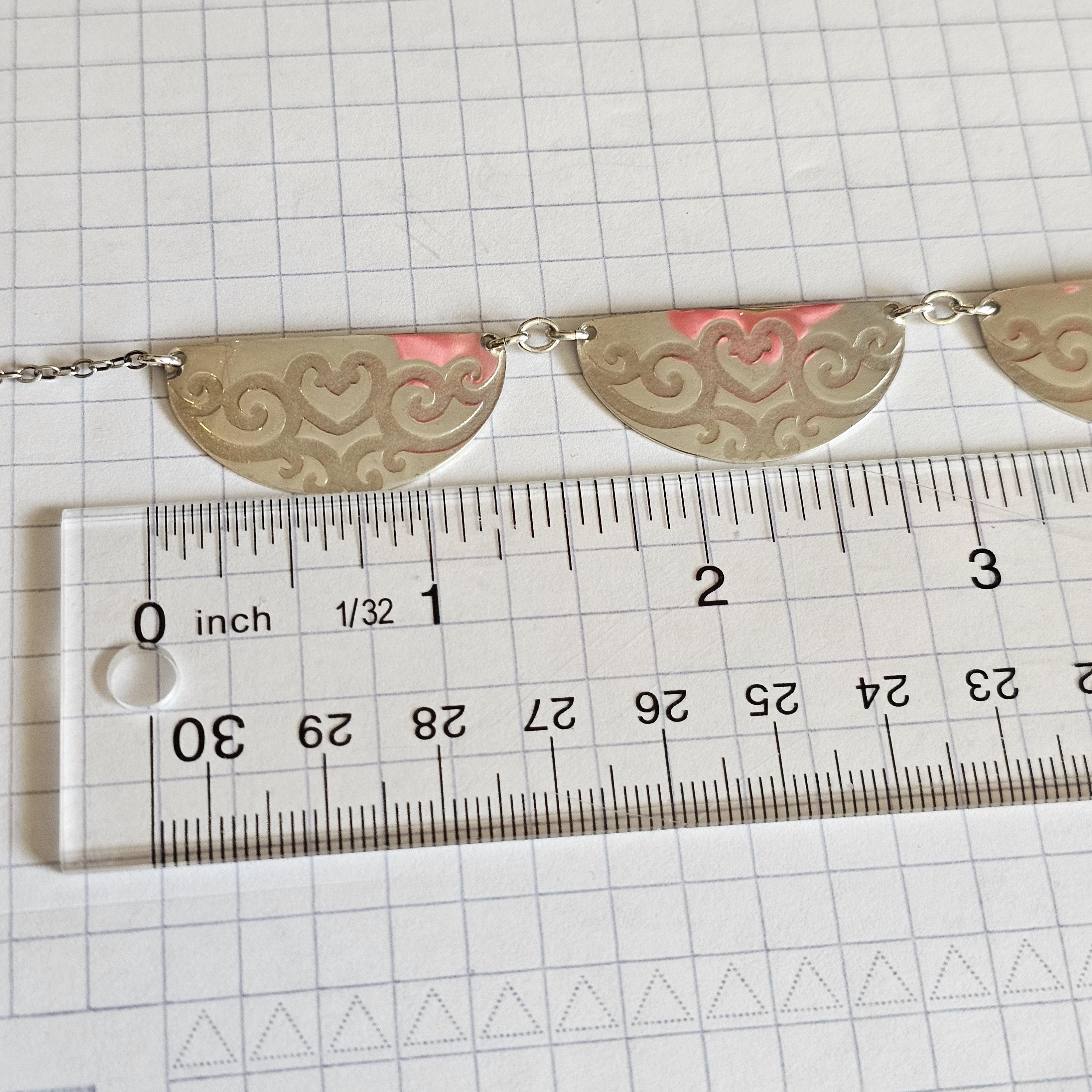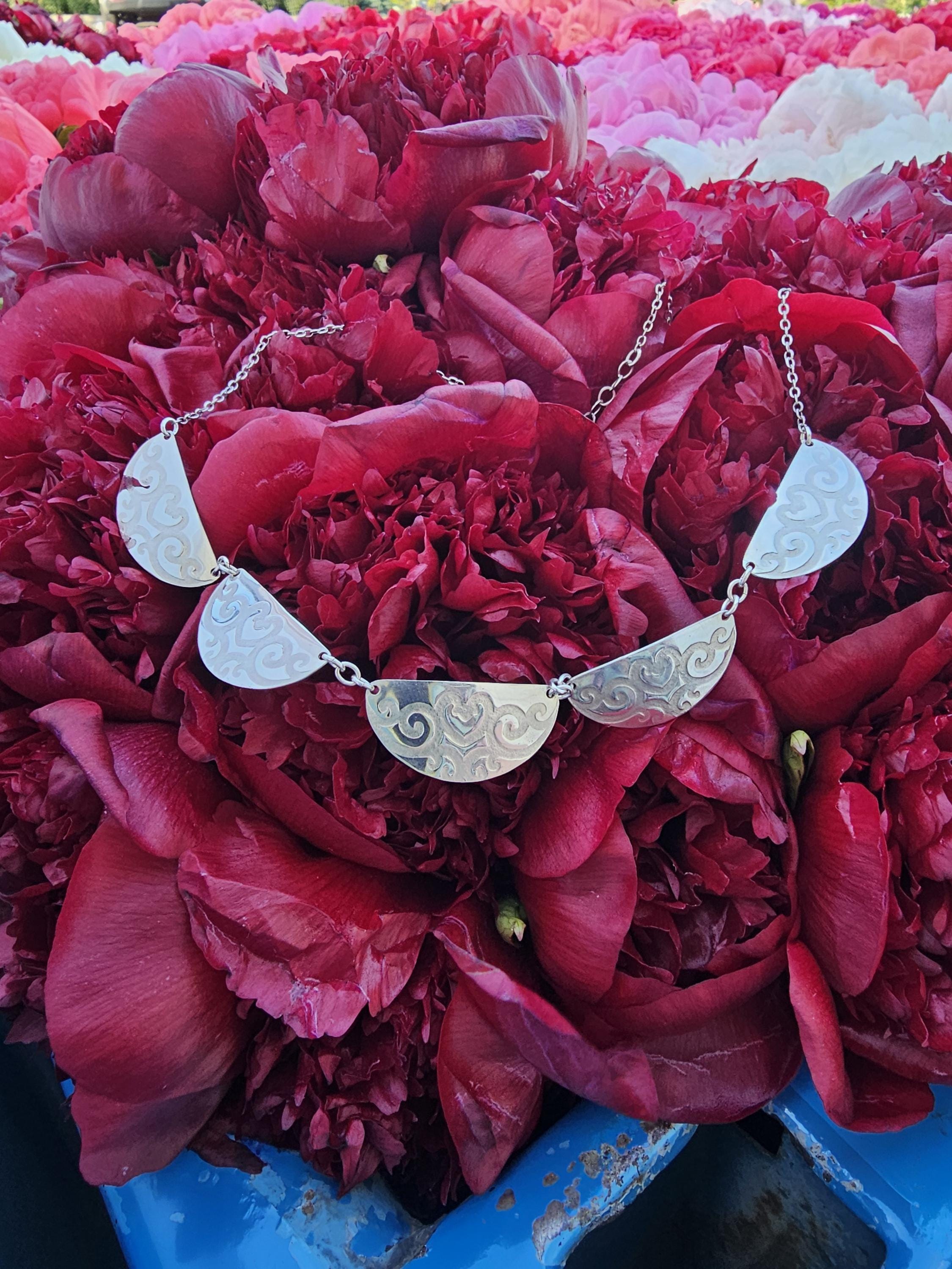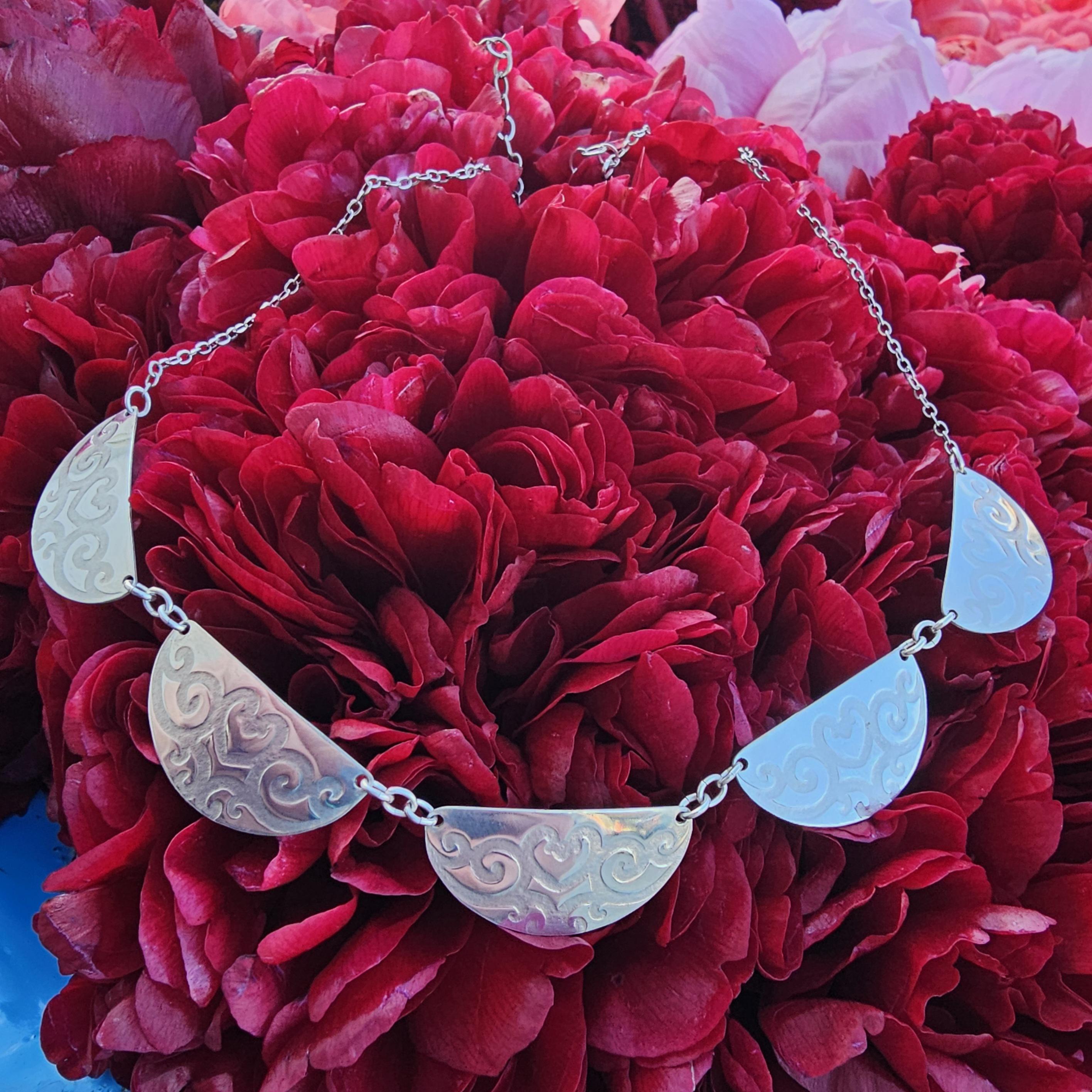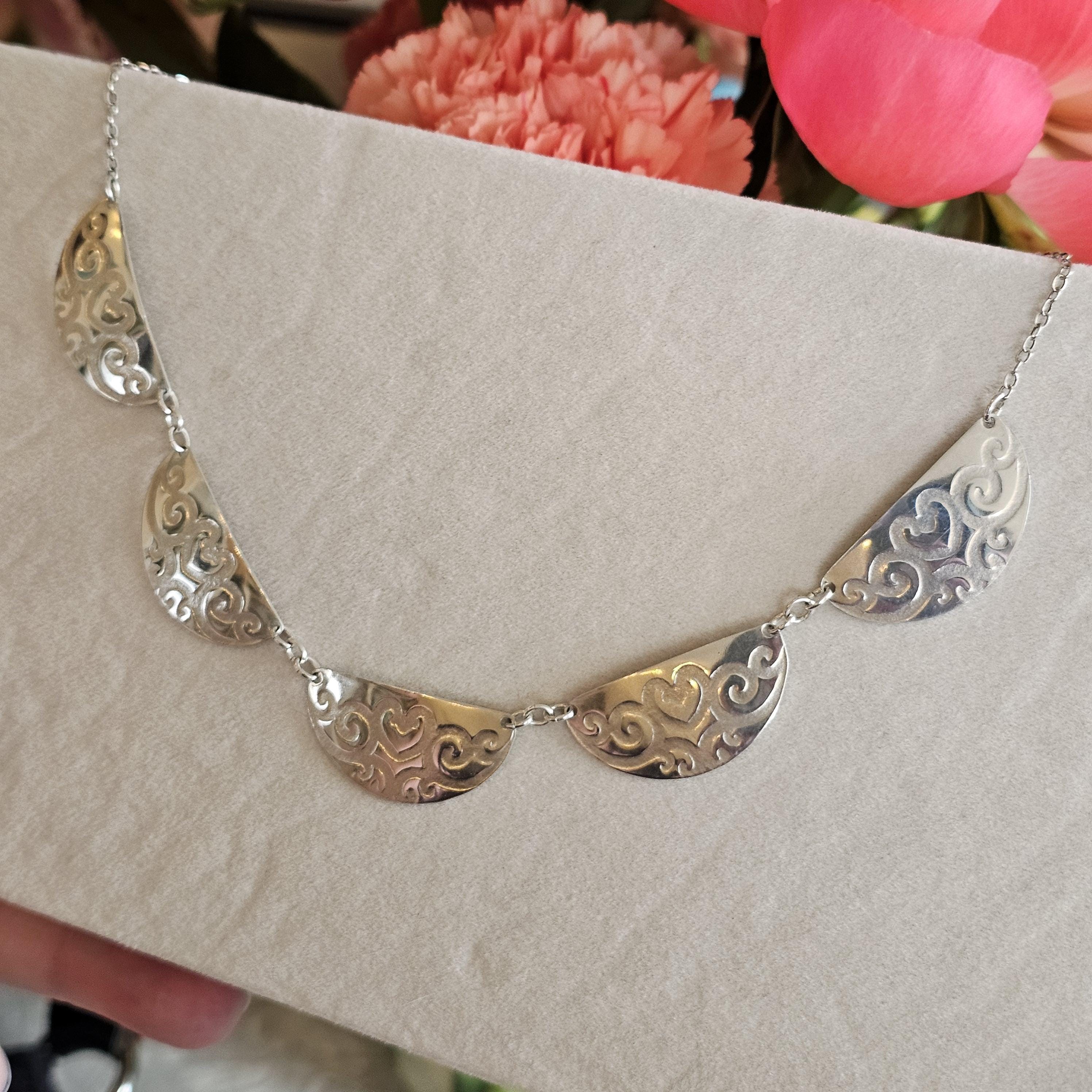 Roller Printed Sterling Silver Scalloped Bib Necklace with Heart Vine Design