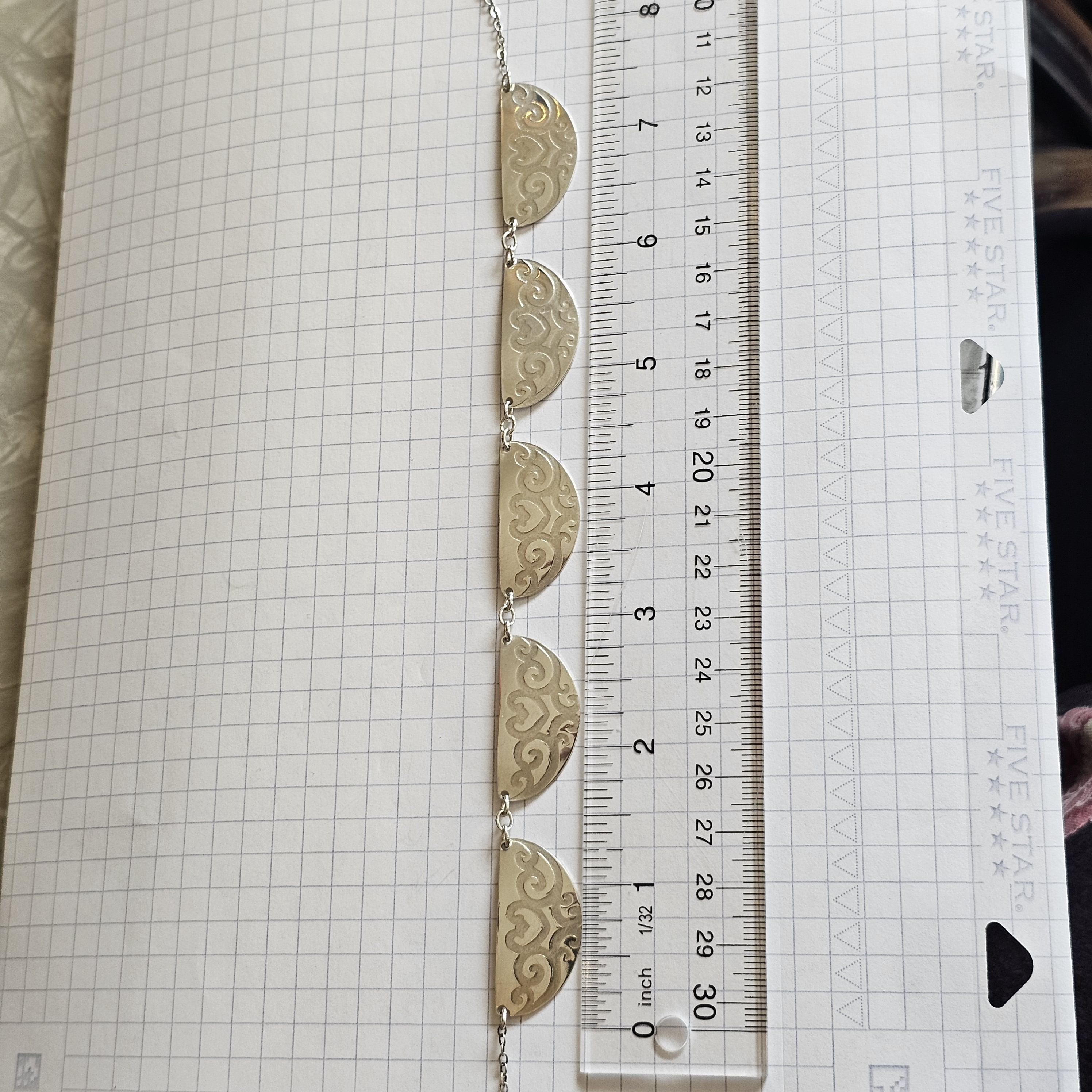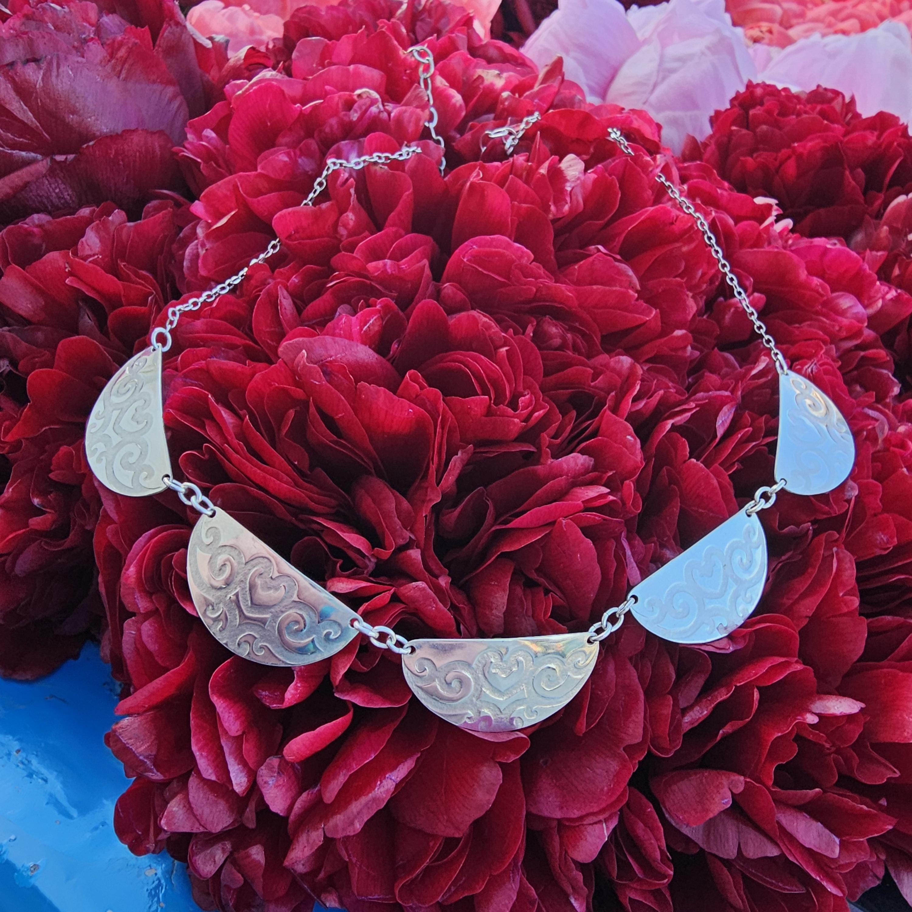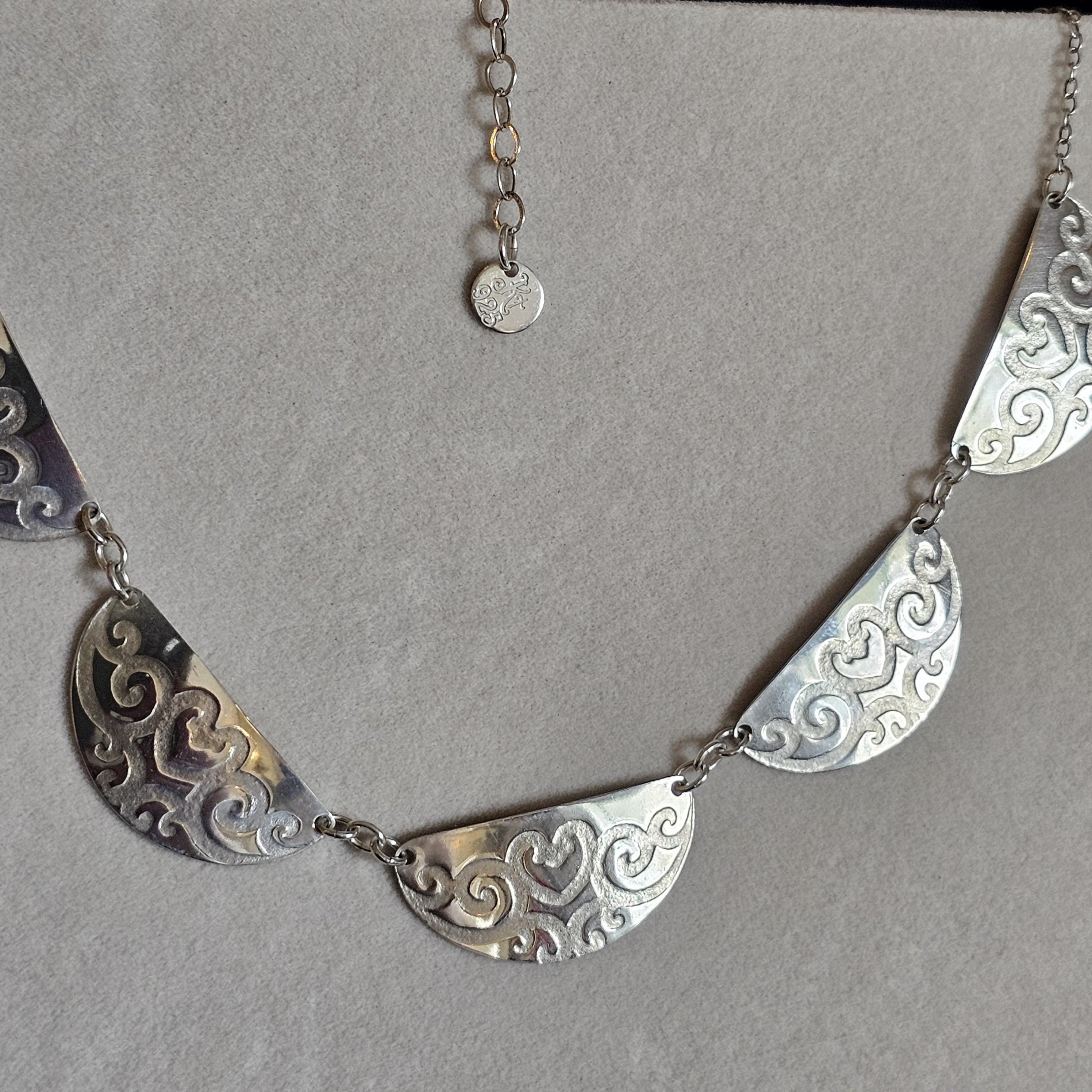 It features five, half circle-shaped sterling silver pendants, each embossed with a swirling vine pattern. The pieces are linked together with delicate sterling silver chain, creating a lightweight yet dramatic collar that sits elegantly across the collarbone.