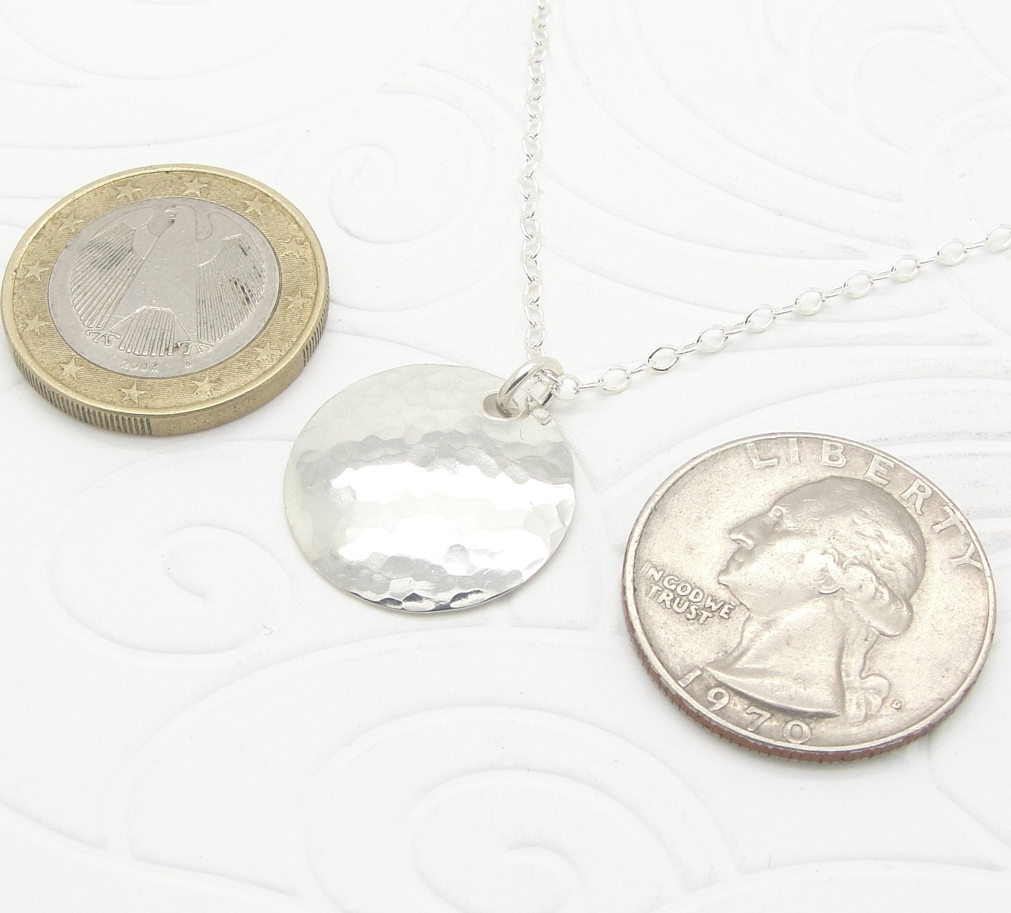The sterling silver has a great shine, and is a small, just over 3/4" diameter (19 mm). The necklace has an 18" (45.7 cm) sterling silver cable chain, and other sizes are available during checkout.