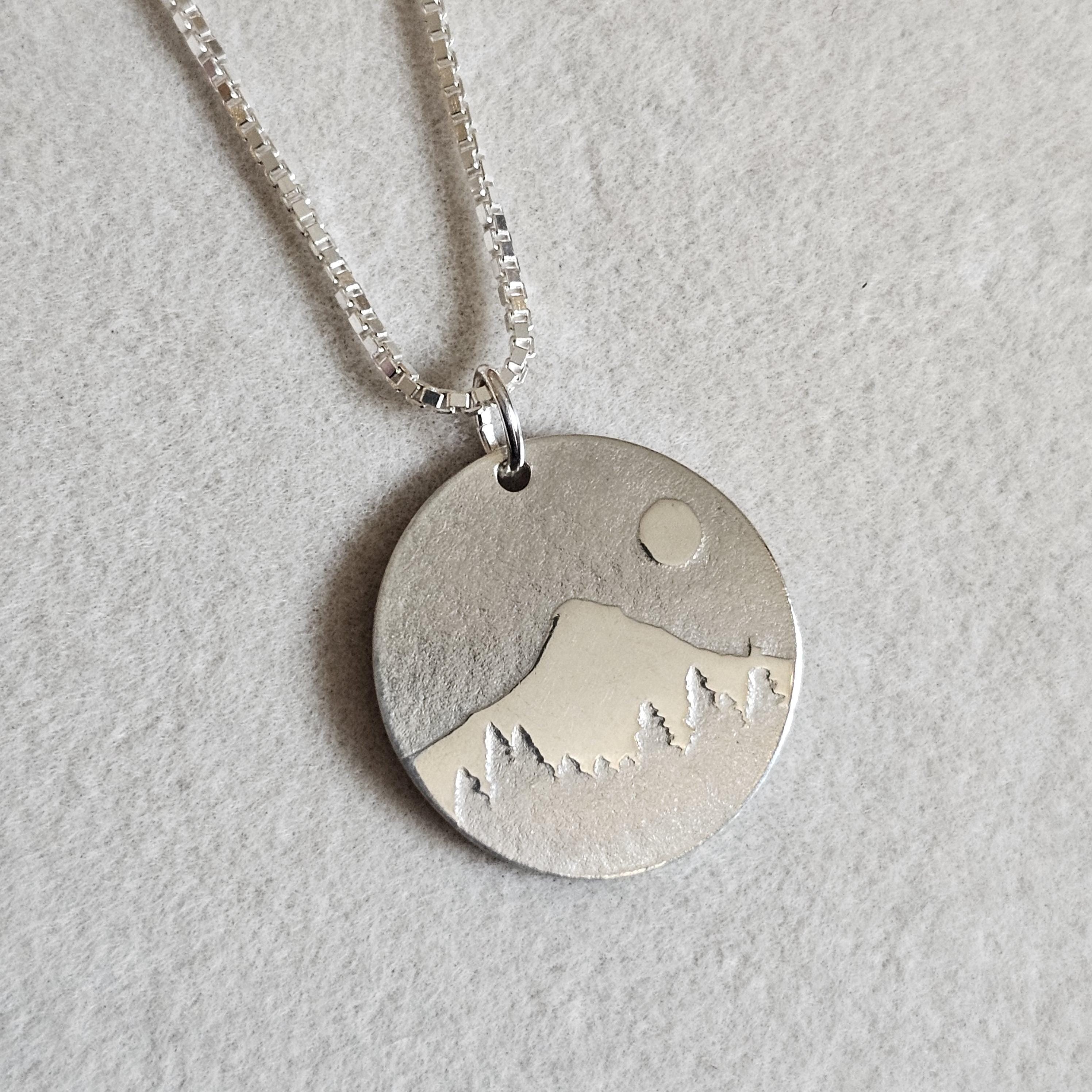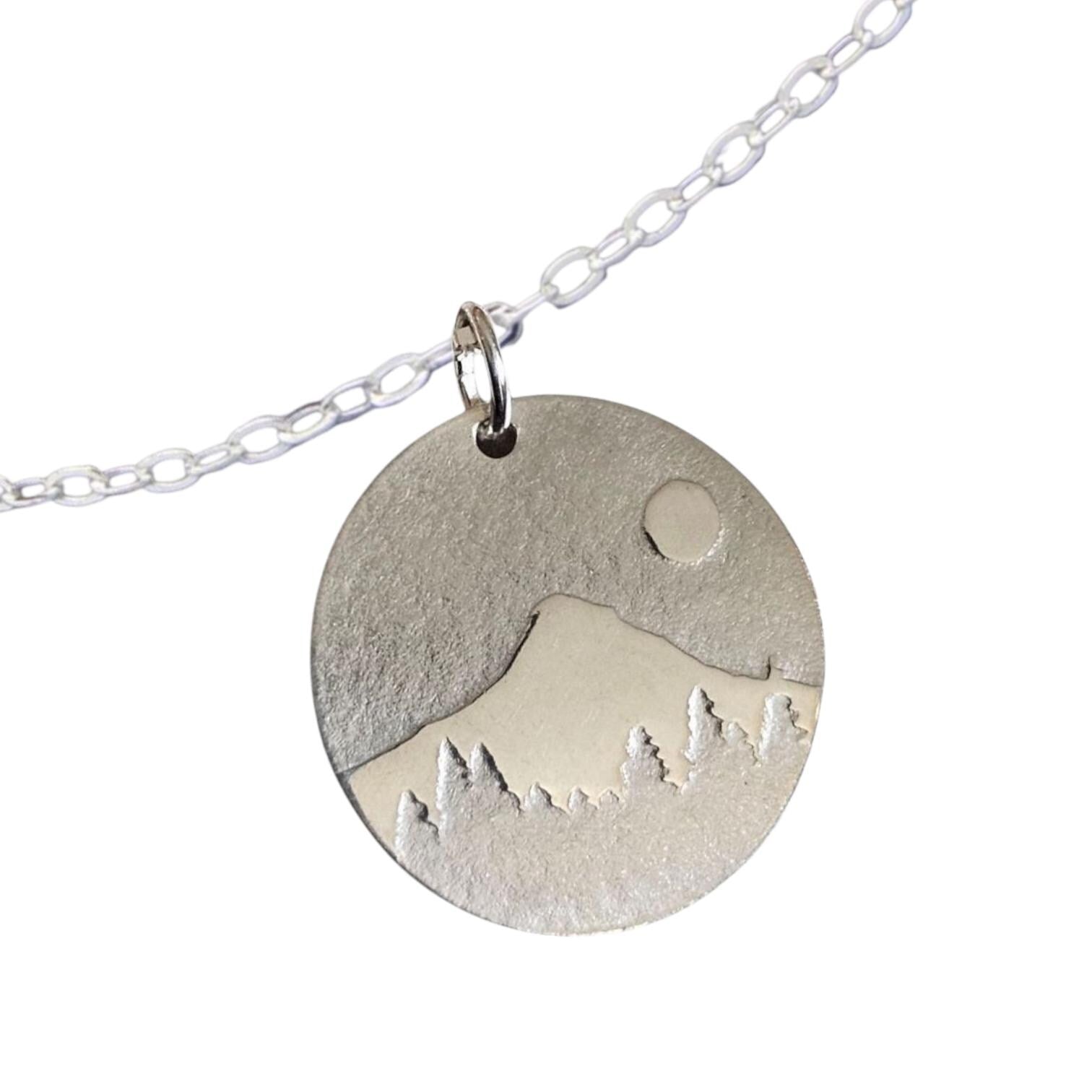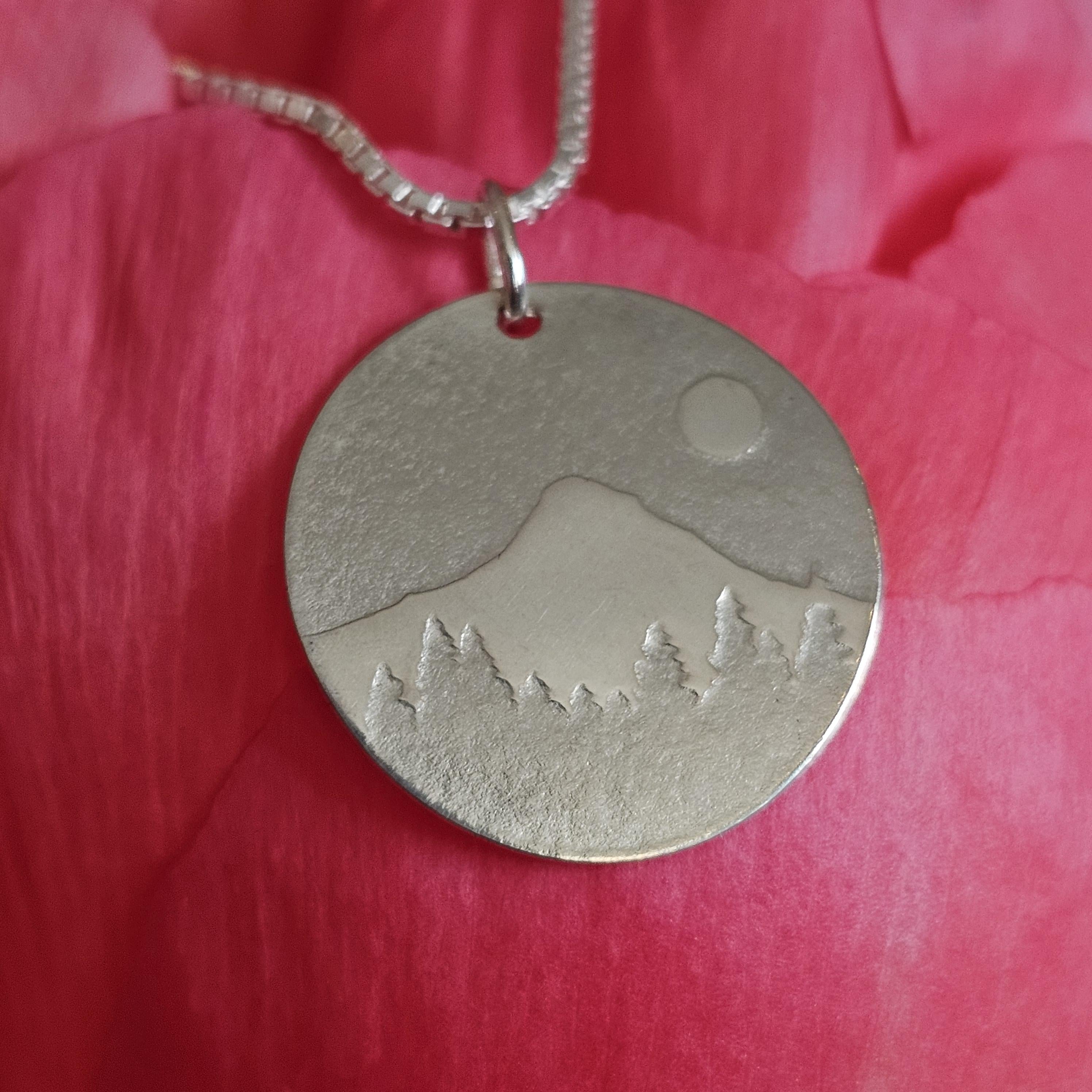 This lightweight small sterling silver disc necklace with a mountain scene pressed into it by me. I used my small size (3/4 inch diameter) of silver disk and rollerprinted the design into it. The scene was fashioned off of Mt. Hood essentially in my back yard in Oregon, in the Pacific North West. It is comfortable and especially pretty with its sterling cable chain.