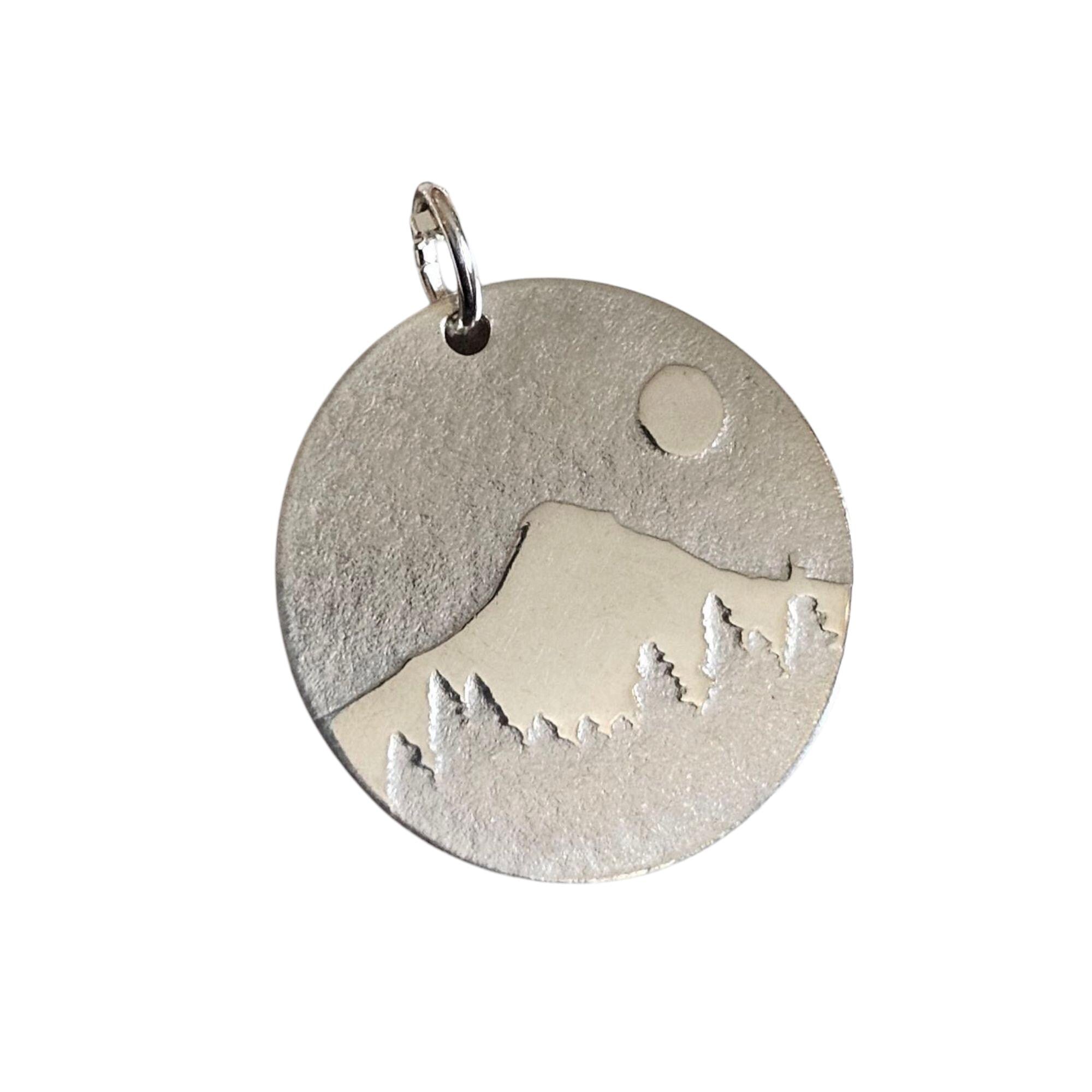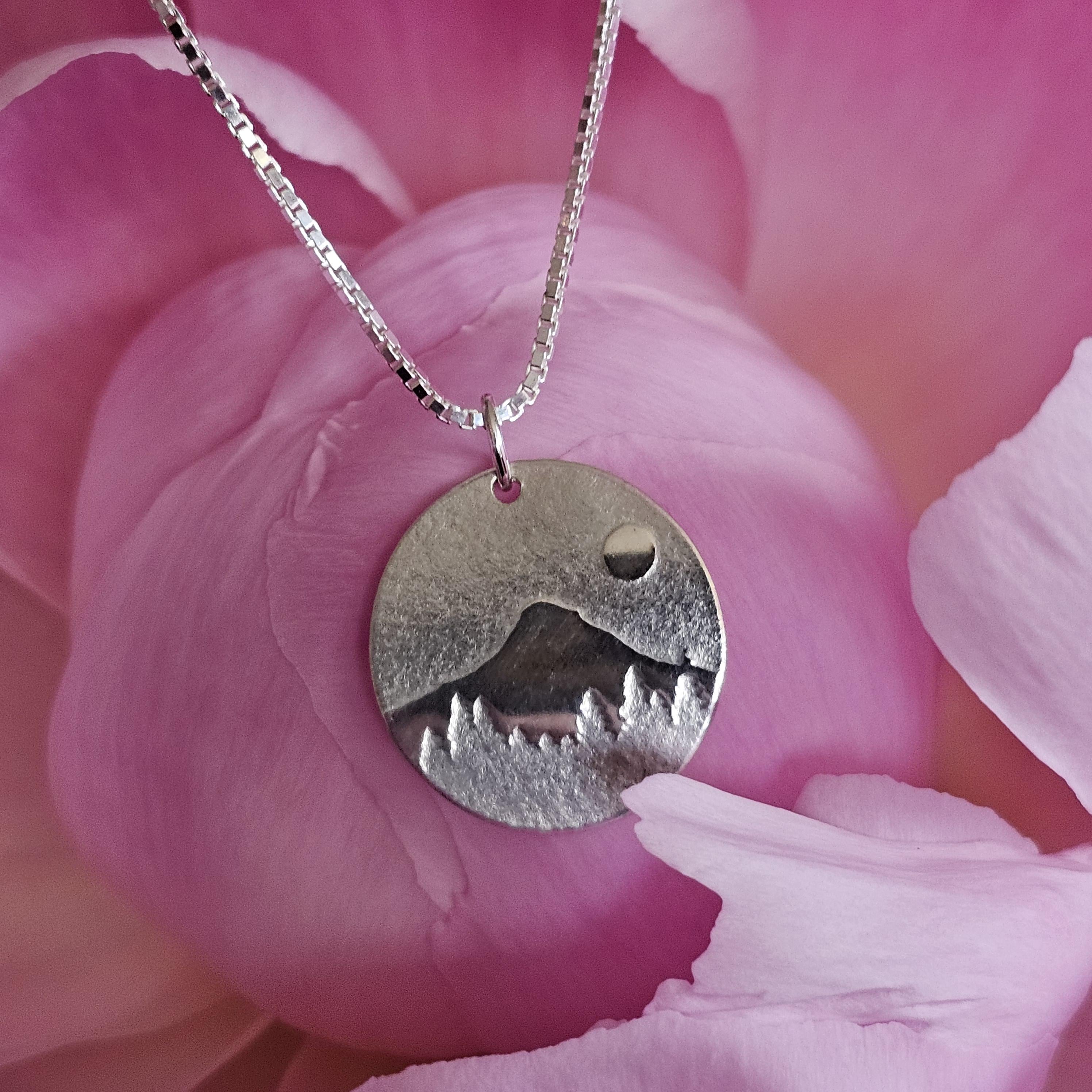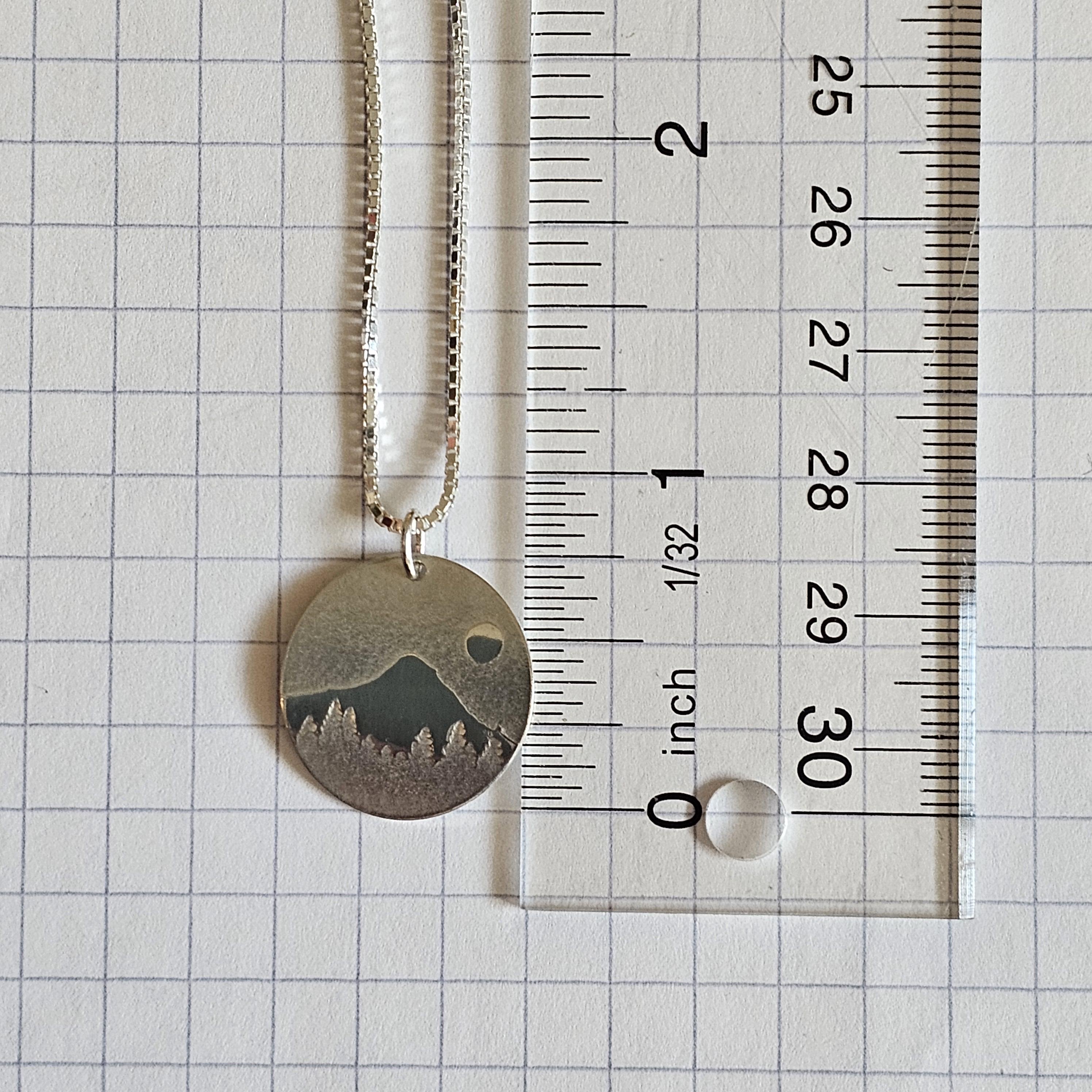 This lightweight small sterling silver disc necklace with a mountain scene pressed into it by me. I used my small size (3/4 inch diameter) of silver disk and rollerprinted the design into it. The scene was fashioned off of Mt. Hood essentially in my back yard in Oregon, in the Pacific North West. It is comfortable and especially pretty with its sterling cable chain.